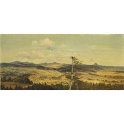 Eifellandschaft. Oel auf Vélin, auf Karton aufgezogen. - <U>Monogrammiert</U> sowie verso von fremder Hand zugeschrieben und bezeichnet. Größe: 15 x 32,5 cm. Schwach gegilbt und mit Bereibungen an den Rändern. Interessante Arbeit des Künstlers, der sich nach 1867 fast ausschließlich Landschaftsdarstellungen aus dem Spessart, dem Odenwald, dem Harz und der Eifel widmete. Gerahmt.