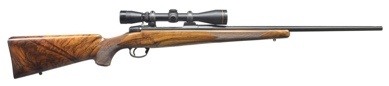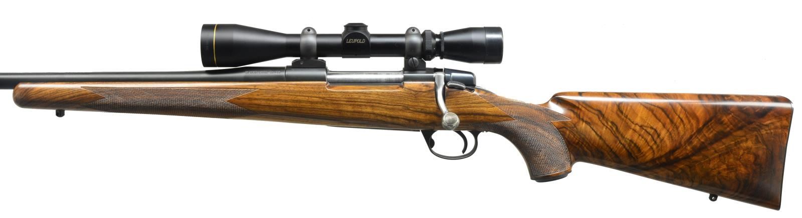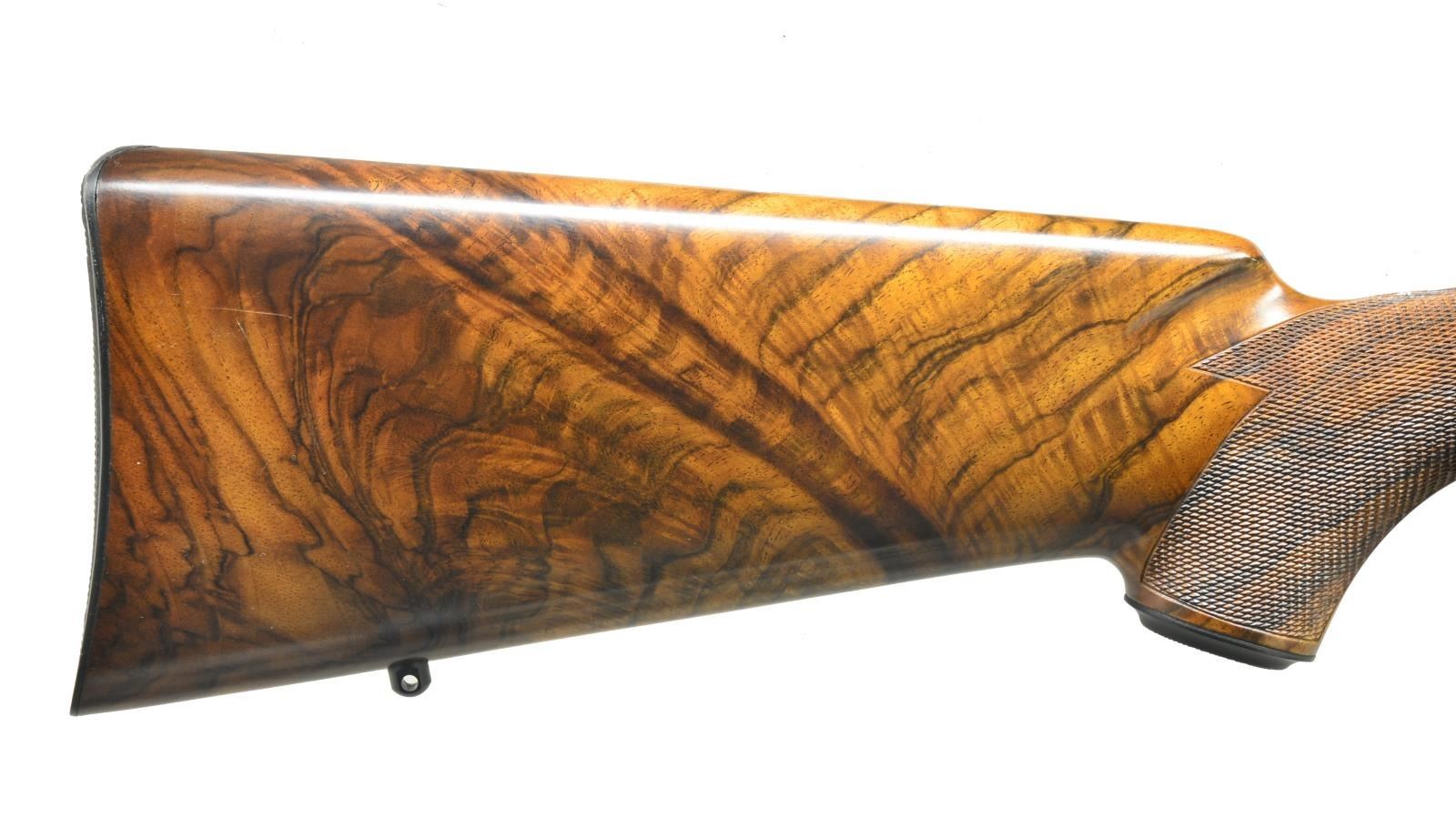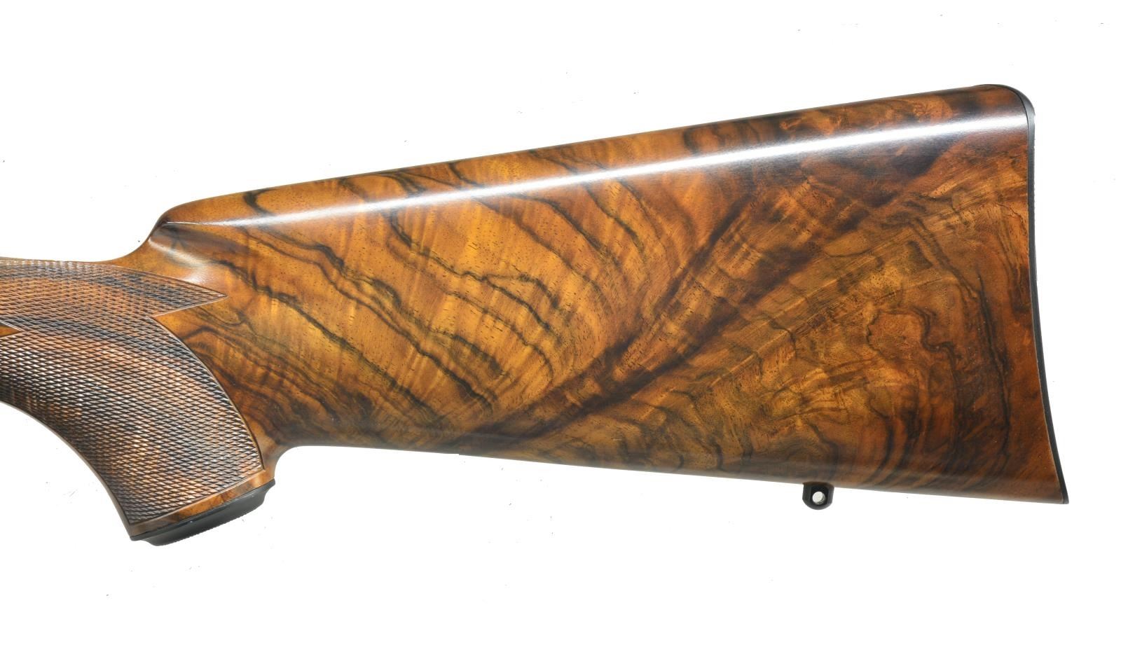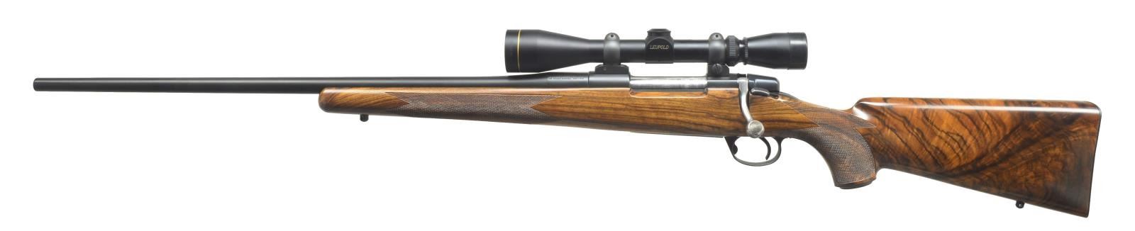 SPECTACULAR FIGURED ENGLISH WALNUT STOCK BY VICTOR STRAWBRIDGE; MADE FOR JIM FENDER W/ SCOPE. Cal. 30-06. S# 518587. Bbl. 24 1/2" number 2 weight, marked "MCGOWAN BARREL 30-06" at left rear. HVA push feed Mauser type left hand action (consignor states "Carl Gustav manufactured less than 200 before ceasing production in 1972.") still retains standard trigger & bottom metal. Bolt handle has been checkered in 3 panels. Rifle is fitted w/ Leupold 3x9 Vari-X IIC scope w/ crosshair & dot reticle in Buehler rings & bases. Rifle is stocked in a wonderful piece of exhibition quality English walnut w/ near perfect grain structure through grip into forend. Butt section is of feather crotch figure w/ a literal whirlwind of veining transfixing butt on both sides. Stock is by Victor Strawbridge, regionally noted gunsmith of Dover, NH, & measures 14" over checkered steel Neidner type buttplate w/ trap. Trap has space for storage of 4 cartridges. Victor's initials & "90" are visible stamped in wood. There is well done point pattern borderless checkering at grip & around forend. A checkered steel grip cap is fitted along w/ sling eyes on bottom of butt & forend. UNATTACHED ACCESSORIES: typed document written by consignor James Fender. CONDITION: metal parts retain essentially all of a teflon coating except bolt which has some minor staining on knob. There are a few minor marks in hand rubbed oil finish of stock, mostly on right side above trigger. Bore is excellent, mechanically fine. Scope has matte finish, optically clear. This rifle was made for noted gun writer James Fender & he states "This rifle has taken all North American game, except the big bears." (20-2398/MGM64). MODERN. $2,500-3,500.