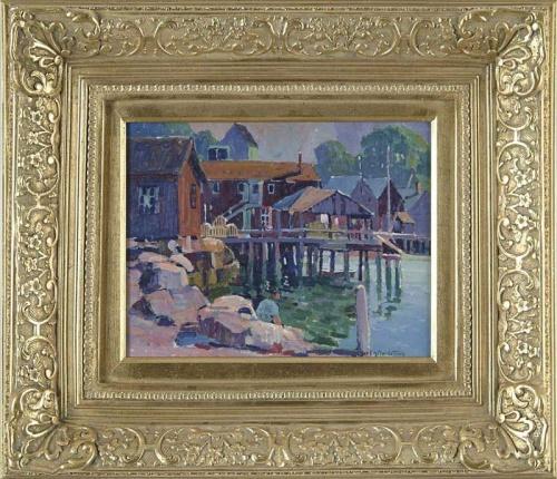 CARL HAROLD NORDSTROM (American, 1876-1965) HARBOR WHARFS. Fine oil on board harbor scene shows several wharfs with buildings alongside water with figure seated on rocks and mooring post. Signed lower right. Housed in a fine gilt reproduction wide fancy frame. The reverse of painting is painted with an unfinished landscape. SIZE: 11" x 14". CONDITION: Very good, some inpainting. 9-27577