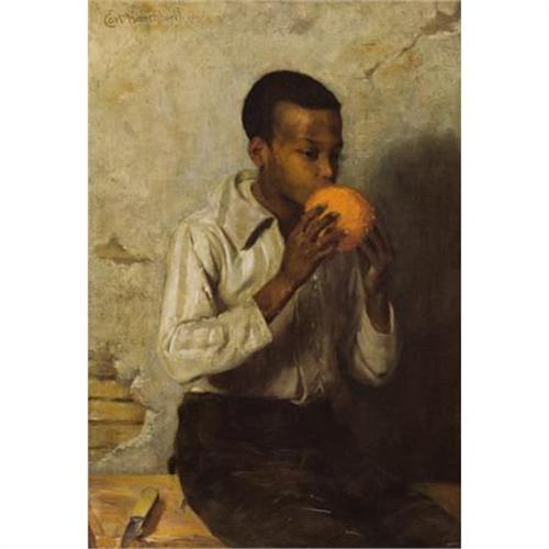 <B>CARL HIRSCHBERG (American, 1854-1923)</B></I><BR><I>The Orange</B></I>, 1891<BR>Oil on canvas<BR>22 x 15 inches (55.9 x 38.1 cm)<BR>Signed and dated upper left: <I>Carl Hirschberg 1891</B></I><BR>Titled, signed, and dated verso on the top stretcher: <I>The Orange / By Carl Hirschberg 1891</B></I>