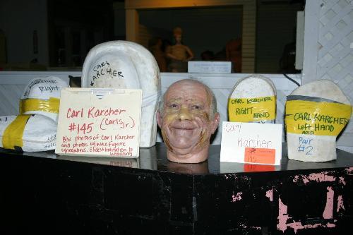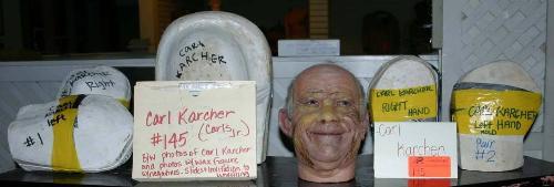 CARL KARCHER (Founder of Carl's Jr. Restaurants) wax head. Includes negatives and pictures of Carl Karcher with his wax figure, and several colored and black & white photos of Carl Karcher, slides and invitation to unveiling. Also includes head mold and 2 sets of hand molds.