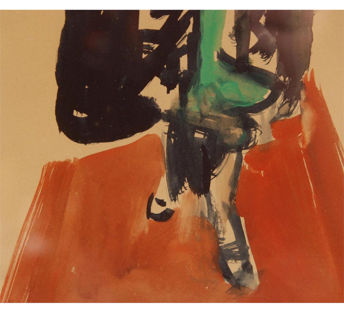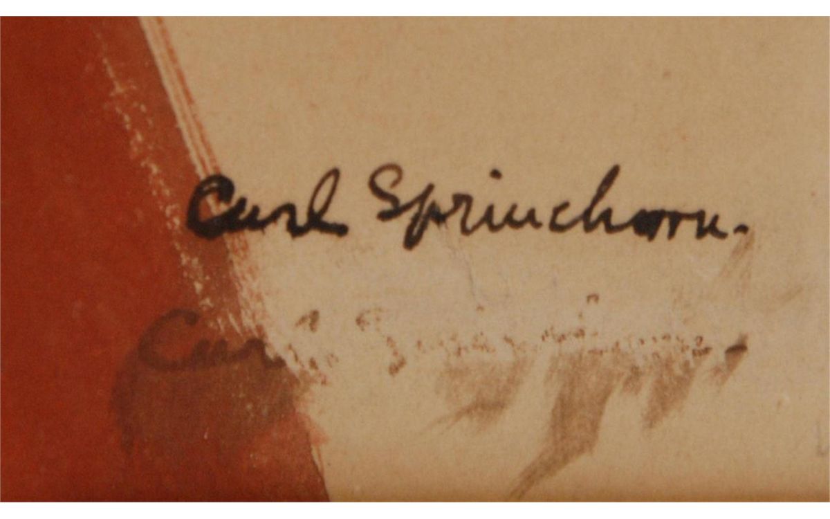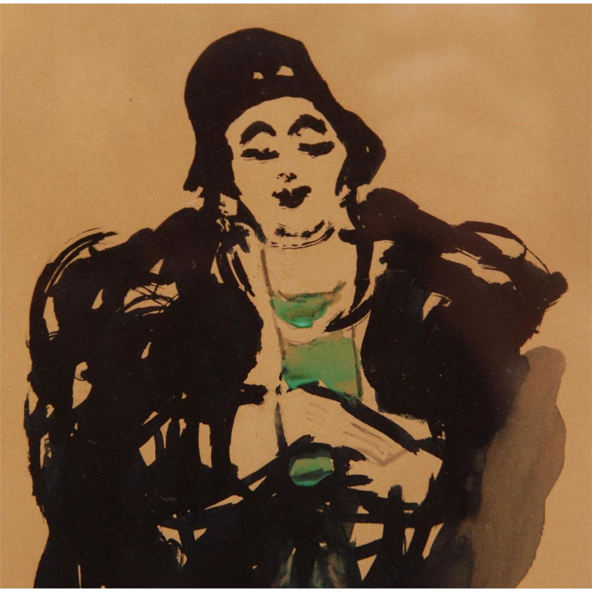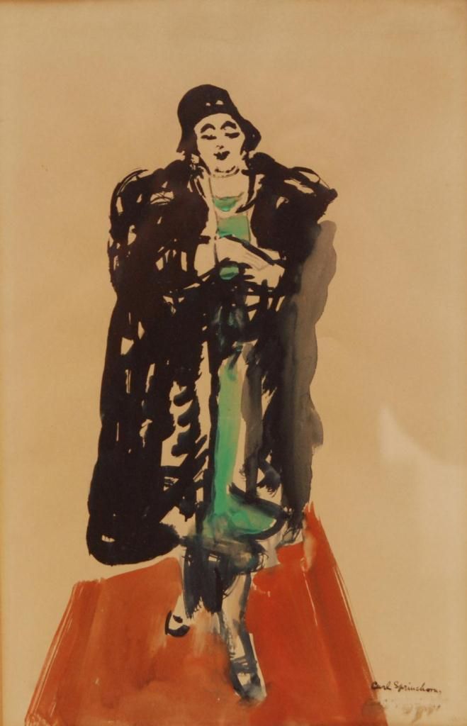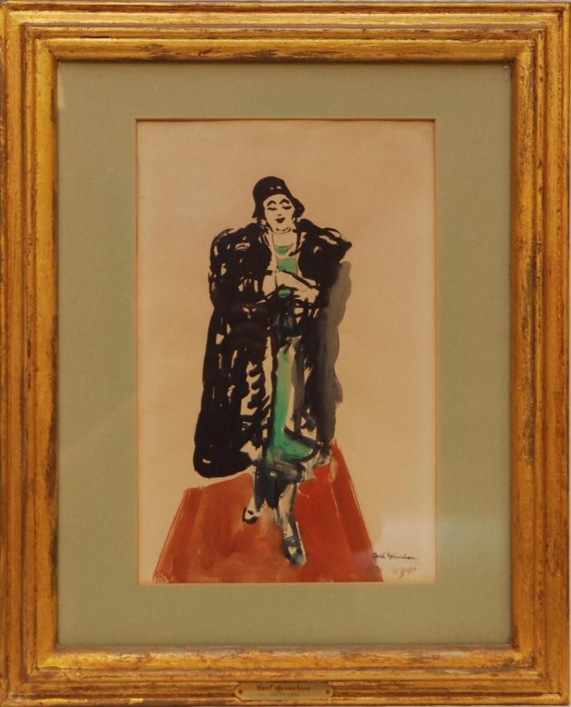 Carl Sprinchorn (AMERICAN, 1887-1971) watercolor painting depicting a woman wearing a black coat. Signed to lower right. 14" height x 9" width + 4" mat & frame (35.5cm x 22.8cm + 10.1cm). Provenance: Sam Feldman Collection.