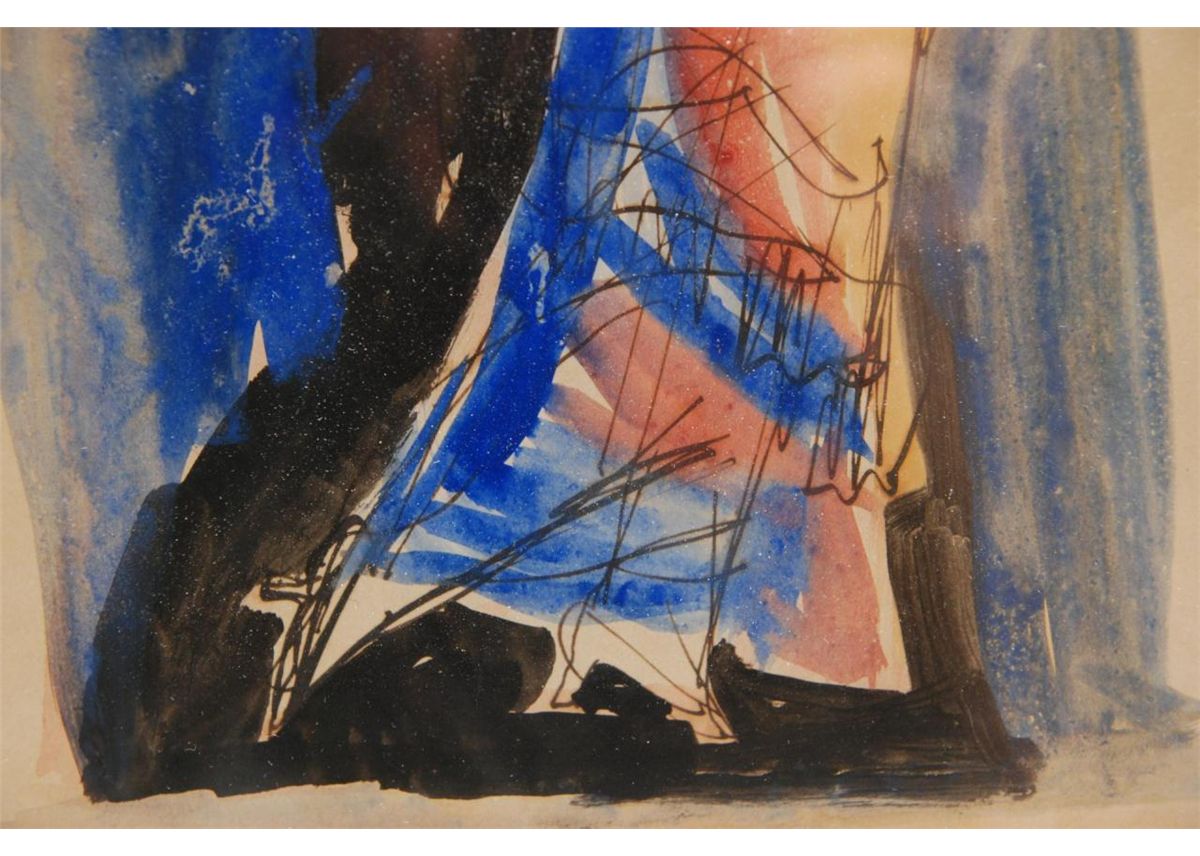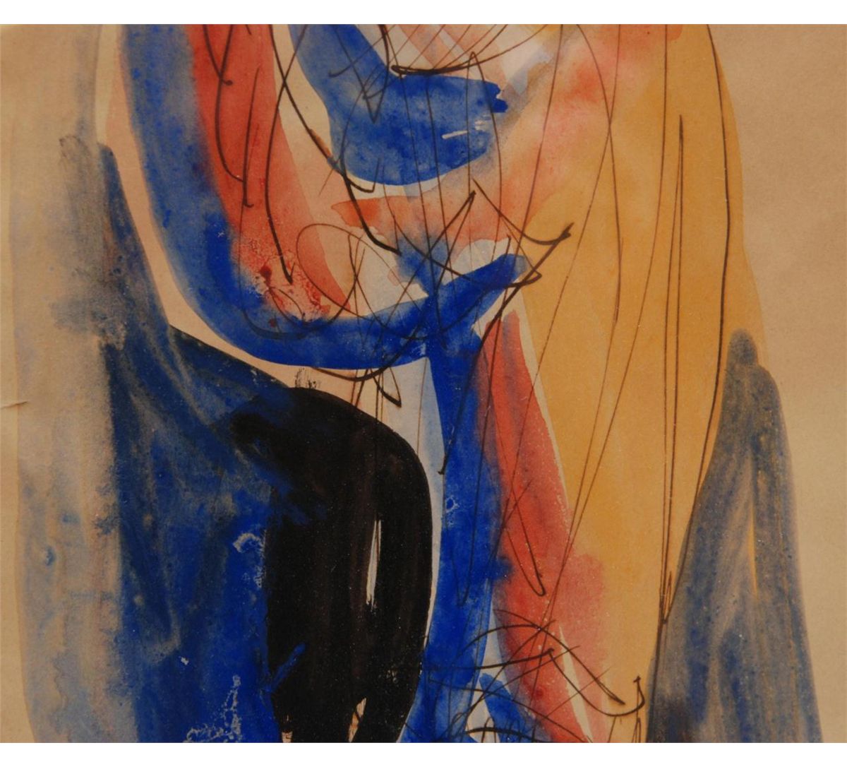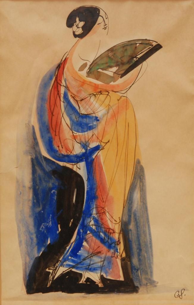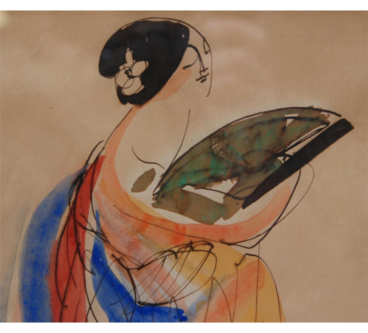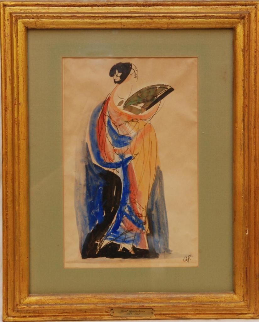 Carl Sprinchorn (AMERICAN, 1887-1971) watercolor painting depicting a woman holding a fan. Initialed to lower right. Measures 14" height x 9" width + 4" mat & frame (35.5cm x 22.8cm + 10.1cm). Provenance: Sam Feldman Collection.