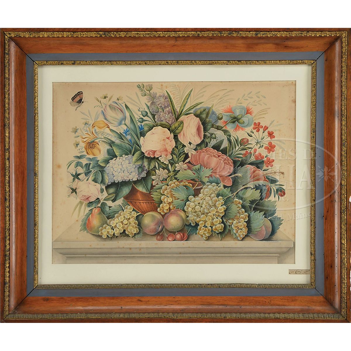 Watercolor on paper Housed in a 19th century wood frame with gilt trim having edge losses Signed "Carlo Carvoli", lower right SIZE: Sight: 18-3/4" x 25-1/2". Overall: 30-1/4" x 36" PROVENANCE: A fine Augusta, ME estate CONDITION: Spot foxing, two small holes in upper right corner, age toning, otherwise good. Examined out of frame 9-29213