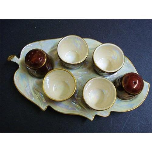 PRECIOUS HARD TO FIND BREAKFAST EGG SET,MADE BY CARLTON WARE IN MOST DESIRED OF ALL FINISHES - ROUGE ROYALE, MADE IN ENGLAND AND SOLD BY BIRKS FAMOUS TOP OF THE LINE IN THOSE DAYS JEWELRY STORE, IT CONSISTS OF FIGURAL TRAY RESEMBLING GOLD ACCENTED AND LUSTER FINISHED TRAY, 4 EGG CUPS AND SALT AND PAPER SHAKER,WHICH ARE FINISHED IN GLORIOUS ROUGE ROYAL FINISH, Excellent condition, no chips scratches or cracks, Tray measures about 8 3/4 inch x 5 inch wide, salt & pepper, each stand 1 3/4 high, each egg cup stands 1 1/2 inch high,US Buyer to pay 12.00 for shipping plus insurance.THANKS.