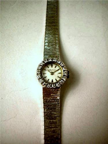 CARLYLE WHITE GOLD AND DIAMOND LADY'S WRISTWATCH, flexible white gold band, back of watch and band both marked 14kt, face surrounded by small diamonds, white dial signed Carlyle, 6", 12.1 dwt., running