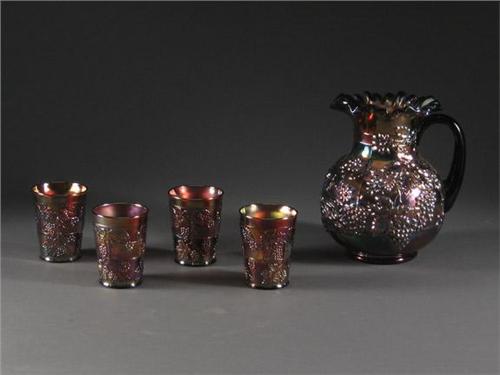 Carnival glass iridescent amethyst pitcher and four tumblers with grape motif. 20th c. No chips or cracks noted. Pitcher 9.25'' H