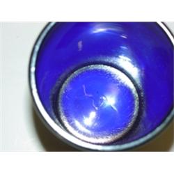 7 PIECE CARNIVAL GLASS WATER SET. Consists of pitcher and six tumblers. Hand painted floral decoration. Three tumblers are marked Northwood. Pitcher has applied cobalt glass handle. Several tumblers have slight wear to edge of top rims. One tumbler has a series of horizontal cracks near top of inside. Tumblers: 3.75” H. Pitcher: 9.75” H