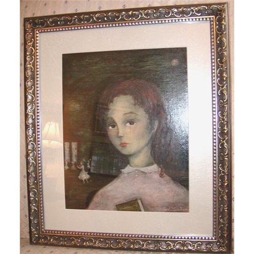 This is an absolutely beautiful painting. Carol Blanchard, b.1918, Springfield, MA, is a listed American artist. She's listed in Who's Who, Davenport's, Askart, and other art sources. The painting is in excellent condition. Painting has been reframed in a lovely silver ornate wood frame, along with a silvery color matboard and is under glass. Surrealist view of a "Saturday Night" fete'. The look in the girl's eyes is haunting. The piece most likely dates to the 1930's period. Painted on masonite board. Written verso "Saturday Night". Signed lower right Carol Blanchard. Measures 14"W x 17"H with the frame.
