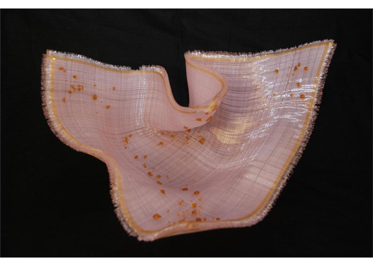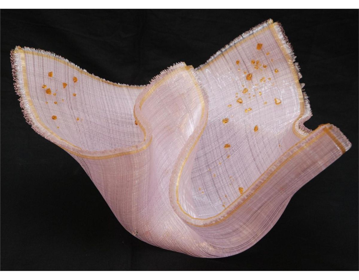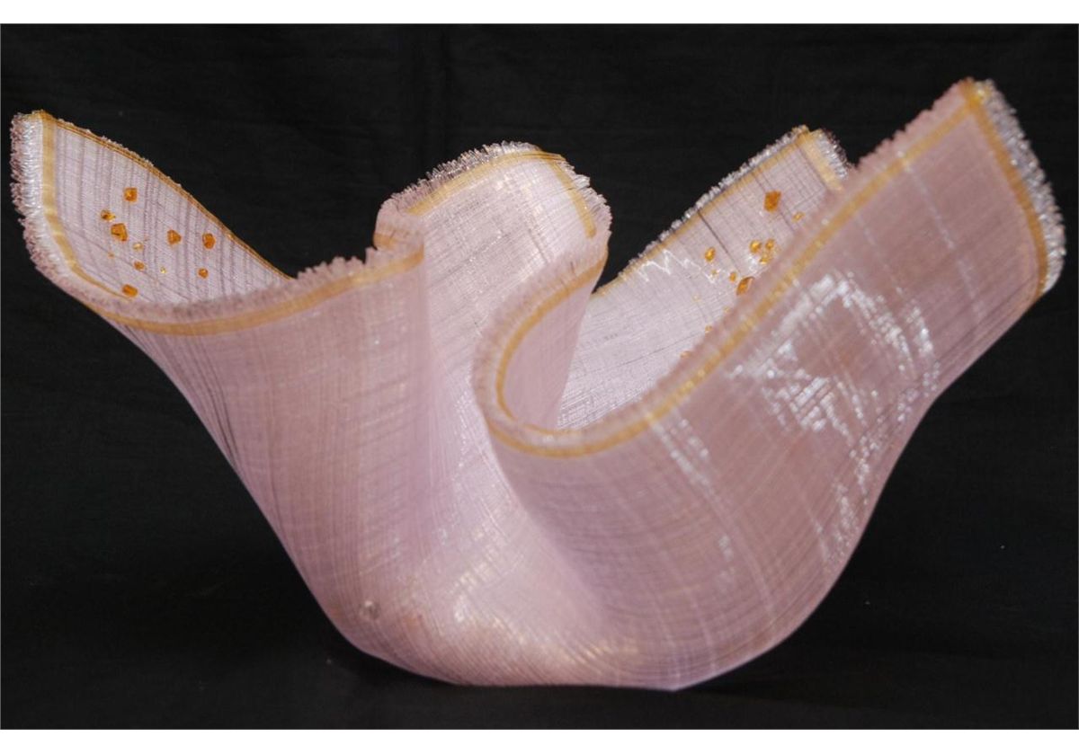 Carole Perry (AMERICAN, 20th century) fused glass tapestry bowl having a pink and gold free form design. Titled 'Gold Canyon Ranch'. Measures 9 1/8" height x 17 1/2" width x 15" depth (23.1cm x 44.4cm x 38.1cm). Total weight of 2501 grams. Provenance: From a prominent Coral Gables estate.