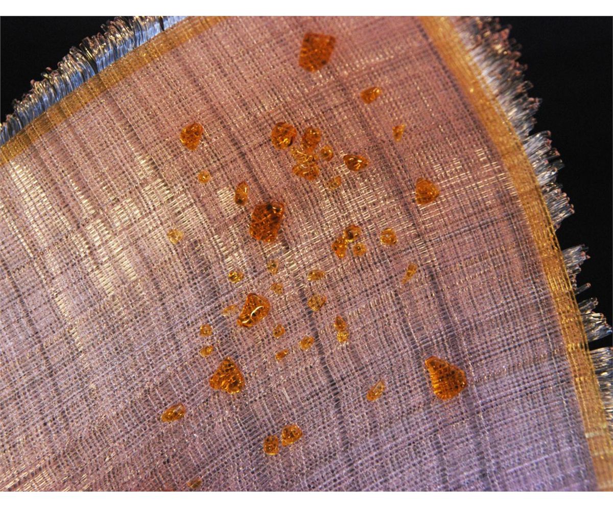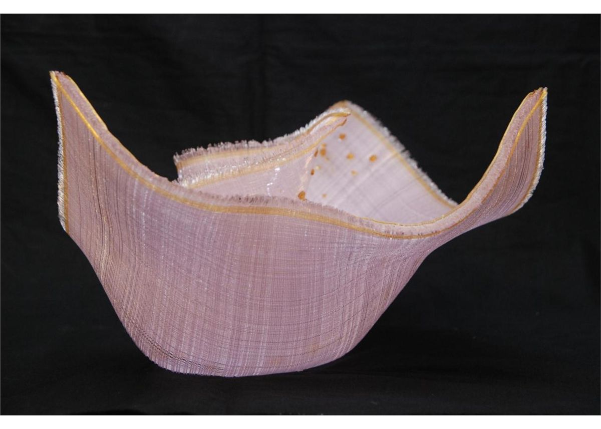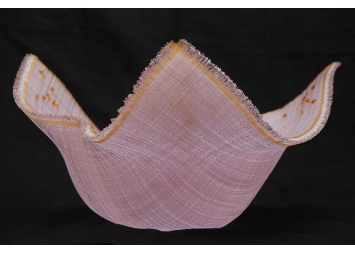 Carole Perry (AMERICAN, 20th century) fused glass tapestry bowl having a pink and gold free form design. Titled 'Gold Canyon Ranch'. Measures 9 1/8" height x 17 1/2" width x 15" depth (23.1cm x 44.4cm x 38.1cm). Total weight of 2501 grams. Provenance: From a prominent Coral Gables estate.