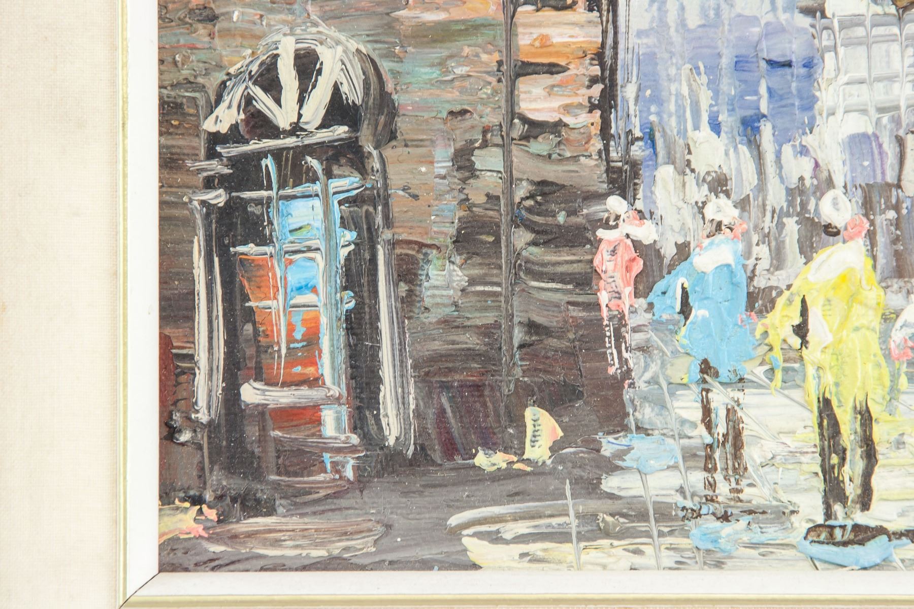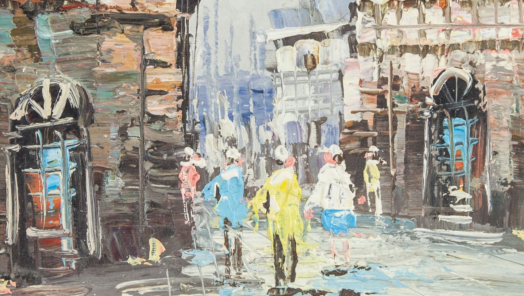 Oil on canvas Parisian street scene. Attributed to Caroline C. Burnett (American, French, 19th/20th Century). 7.5 x 9.5 in (19.1 x 24.1 cm). PROVENANCE: Private collection, Montreal, QC