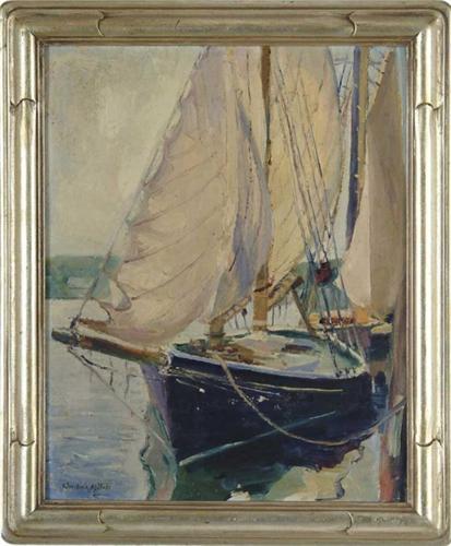 CAROLINE M. BELL (American, Mid-20th Century) HARBOR SCHOONER. Oil on board harbor scene shows a blue hulled two-mast schooner tied to dock. Another boat is scene behind. Signed lower left. Housed in a fine carved wood gilt period wood frame. SIZE: 20" x 16". CONDITION: Good. 9-27418
