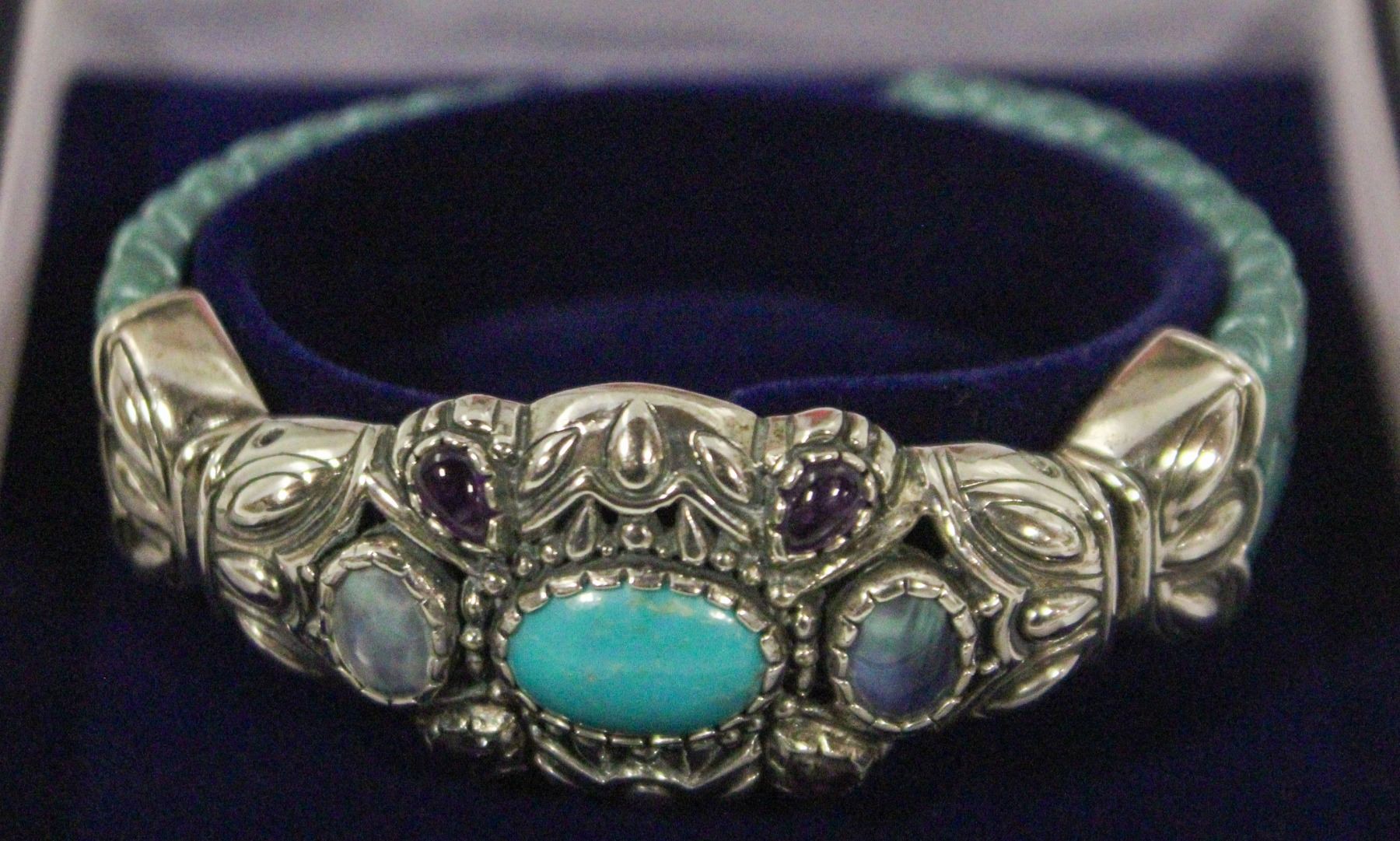 - VERIFIED, VINTAGE, TOTAL WEIGHT OF BRACELET IS 39.3 G'S MINUS 2.5 G'S FOR LEATHER & STONES = 36.82 GRAMS FOR WEIGHT OF THE SILVER, SIGNED "CP 925", WITH NATURAL AMETHYSTS, SHELL STONES & 1 IMITATION TURQUOISE, HINGED CUFF, IN A VELVET BRACELET GIFT BOX
