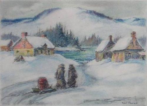 CARON, Paul Archibald, A.R.C.A., 1874-1941. "The Water Carriers -A Laurentian Scene". Pastel, signé. Titré. Pastel, signed. Titled. 3 1/2" x 5" - 8.8cm x 12.8cm.