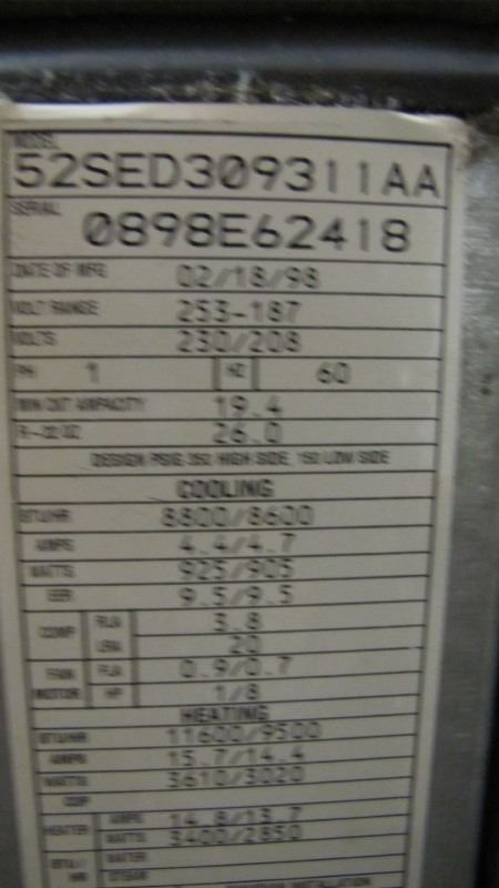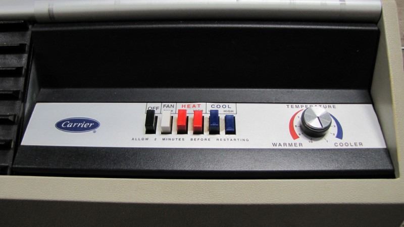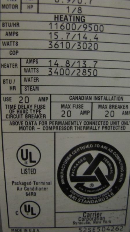 CARRIER IN WALL HEATER / AIR CONDITIONER - FROM A MOTEL UPGRADE - 230 / 208 VOLTS; Cooling 8800 / 8600 BTU/HR; Heating 11600 / 9500 BTU/HR