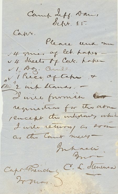 (1817 - 1888) Confederate major general who led with distinction at Cumberland Gap, later captured at Vicksburg, exchanged, and again led his forces from Missionary Ridge to Bentonville. Possible war-date A.L.S. 1p. 8vo., "Camp Jeff. Davis", Sept. 25, [n.y.], to Capt. Samuel G. French, ordering letterhead and adding: "I will furnish requisitions for the above...". Penned boldly on blue letterhead, a bit of bleaching at middle and bottom margin, else very good.