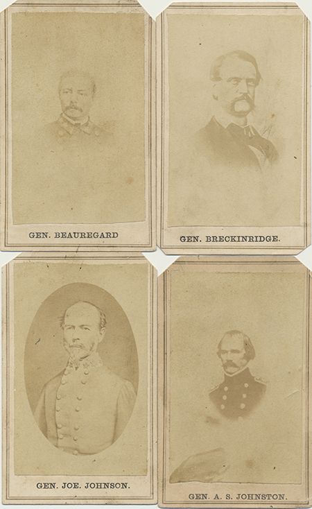 Group of eight CDVs of Confederate generals including P.G.T. Beauregard, John Breckinridge, Albert Sidney Johnston, Joseph Johnston, Leonidas Polk, Sterling Price, Raphael Semmes and Kirby Smith. All of these images bear the photographer's imprint from the Monumental Photograph Company, Baltimore, Maryland. Clipped upper corners, most a bit light, still good condition.