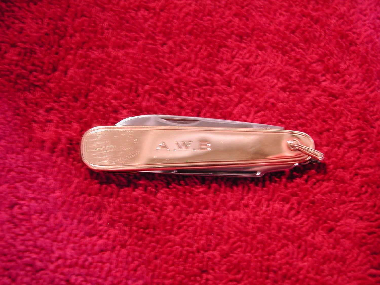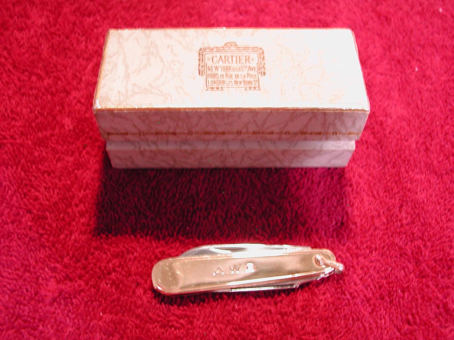 CARTIER 14K AND STAINLESS POCKET KNIFE IN ORIGINAL BOX ,MAKER CARTIER NY 635 5TH AVE, PARIS 13 RUE DE LA PAIX, AND LONDON 175 NEW BOND ST, C1920, EXTREMELY RARE