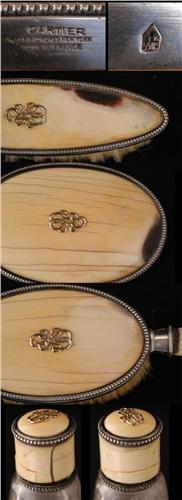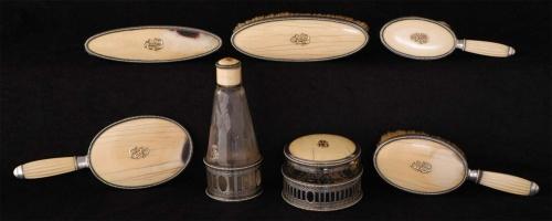 CARTIER 7 PIECE DRESSER SET sterling with ivory and gold circa 1890, imperfections <BR>condition: 4 of 7 pieces with damage. Brush and mirror stained and sanded. Another brush sanded and the bottle with cracked and repaired ivory collar.