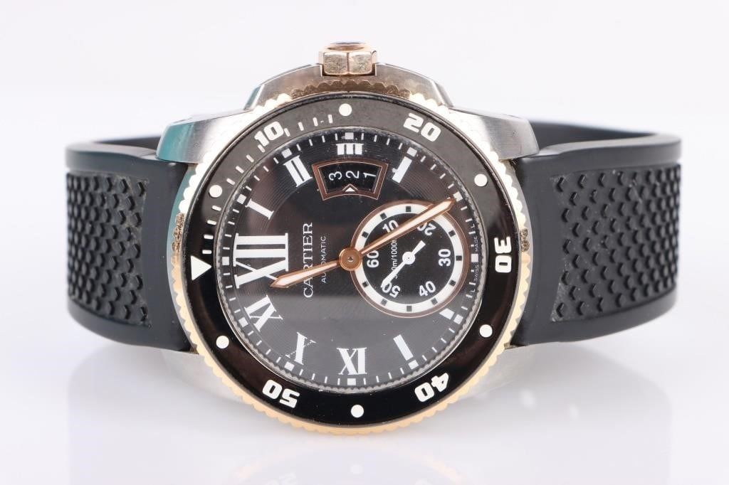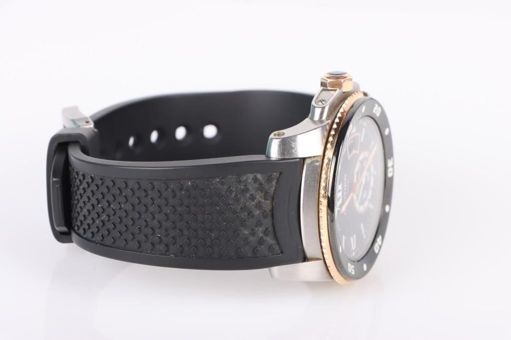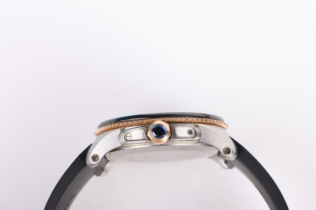 Cartier Calibre de Cartier Diver Rose Gold & Stainless Steel Case Automatic Wristwatch. Reference Number: W7100055. 18k rose Gold crown set with faceted blue spinel.