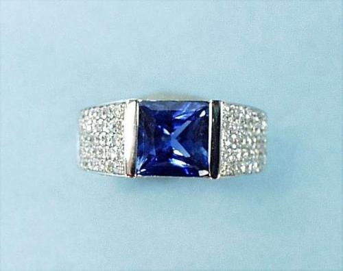 CARTIER, FRANCE - An 18 kt. white gold and diamond ladies' ring set with a very fine rectangular cut sapphire, appx. 2.50 cts, total diamond weight 1.45 cts. Fully marked, with original Cartier certificate. 12000-15000