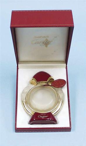 CARTIER, FRANCE - " PANTHERE de CARTIER". A frosted art glass perfume bottle with twin handles in form of panthers. 5 1/2" high. In original presentation case. 400-500