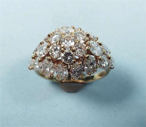 CARTIER, France - An unusual 1950's dome shaped 18 kt. gold ring set with an arrangement of very fine marquise and brilliant cut diamonds in a raised mount, total diamond weight approx. 5.00 cts. Fully marked. 12000-14000