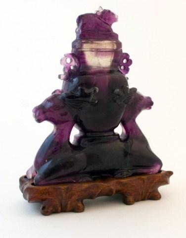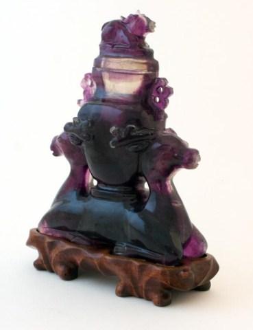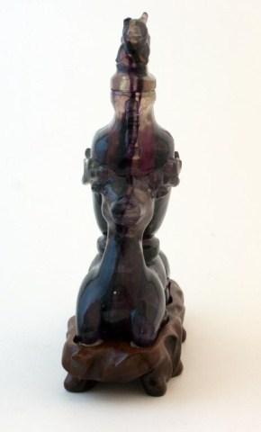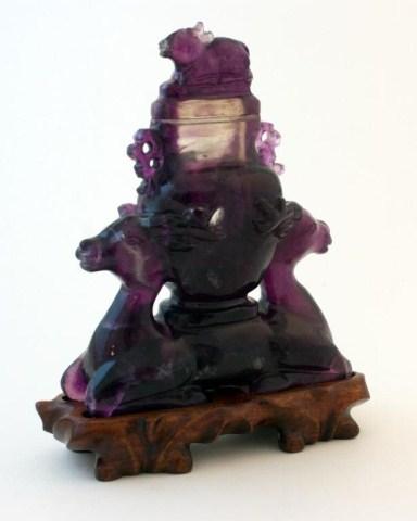 Carved amethyst jar with lid. Supported by two-headed deer. Has carved wooden base. 4 1/2" height x 5 1/2" width.