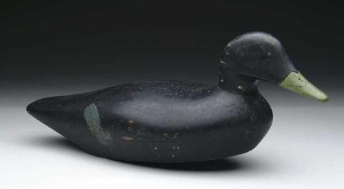 CARVED AND PAINTED BLACK DUCK DECOY ATTRIBUTED TO JAMES WHITNEY, FALMOUTH, MAINE. All over black painted duck has a green bill. Lead keel weight. Small blue painted wings. SIZE: 19” l. CONDITION: Very good. 9-27012