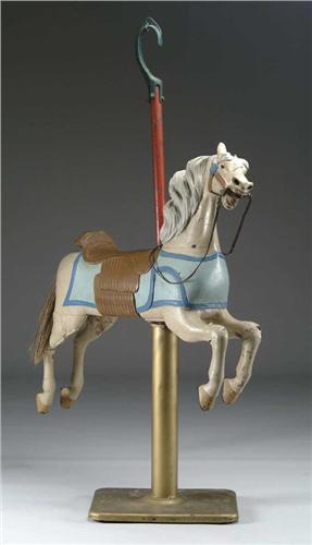 CARVED AND PAINTED WOOD CAROUSEL HORSE. The outside horse has large carved mane, open mouth with carved saddle in running style with front bent legs and outstretching back legs. An old paint surface has an ivory background with light and medium blanket under a brown saddle. It comes with a floor stand with old red and green painted pole with hook. SIZE: 38” h x 52” l. CONDITION: Generally very good, chip to one ear. 9-27114