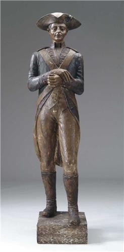 CARVED AND PAINTED WOOD FIGURE OF A SOLDIER. The soldier is dressed in a blue and red coat with white pants and tall boots. He wears a Colonial style hat and has nicely carved facial features. His hands are crossed in front of his chest with one hand cupped to probably hold a flag. Nice whittle marked throughout figure. Probably first half of the 20th Century. SIZE: Figure stands 62-1/2” h. Total is 68-1/2” h. CONDITION: Some scuffing to paint, some minor age cracking. Chip missing from side of hat. Generally very good. 9-27514
