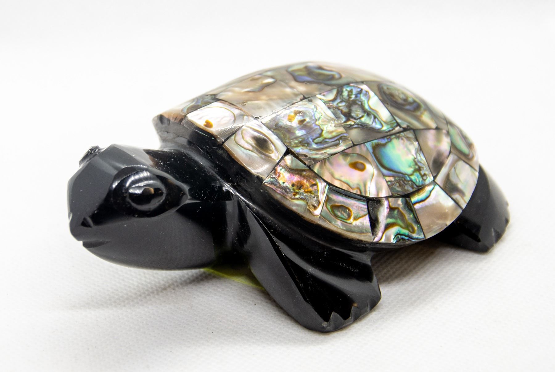 CARVED BLACK ONYX TURTLE WITH MOTHER-OF-