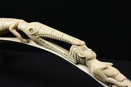 CARVED ELEPHANT TUSK - Late 19th c. African Creation Myth Carved Elephant Ivory Tusk, with snake, fish, and crocodile with womans head in its mouth, fish swallowing her feet, she is in loincloth only, hollow carved through to crocs mouth, shaped tip and mouth allows tusk to stand upright, 29 1/4in long overall, 2 1/4in x 2 3/4in at mouth