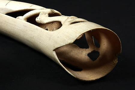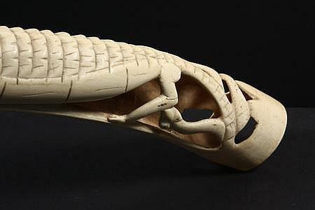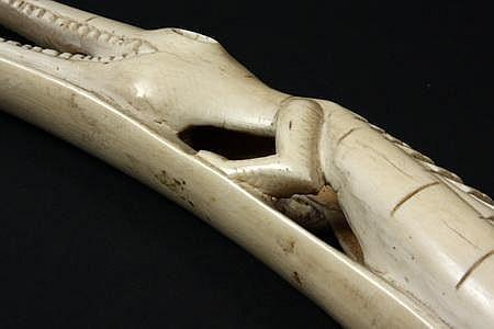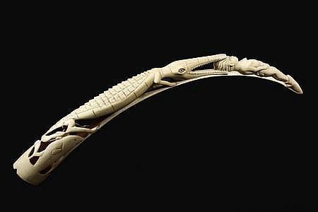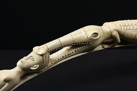 CARVED ELEPHANT TUSK - Late 19th c. African Creation Myth Carved Elephant Ivory Tusk, with snake, fish, and crocodile with womans head in its mouth, fish swallowing her feet, she is in loincloth only, hollow carved through to crocs mouth, shaped tip and mouth allows tusk to stand upright, 29 1/4in long overall, 2 1/4in x 2 3/4in at mouth