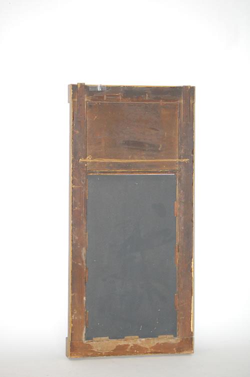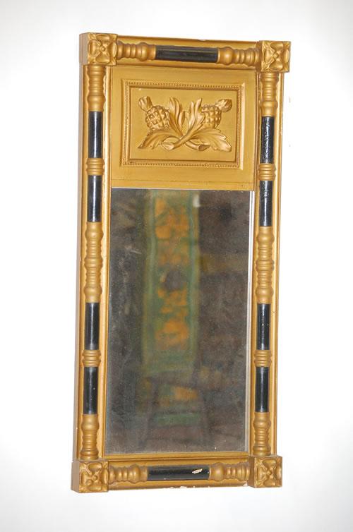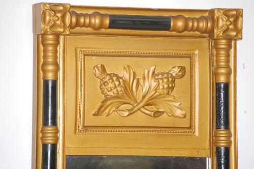 CARVED FEDERAL SPLIT COLUMN MIRROR - 19TH CENT. SPLIT COLUMN 2-PART MIRROR IN GOLD & BLACK PAINT W/ UPPER RAISED PANEL TABLET W/ CARVED PINEAPPLES IN GOLD PAINT (43" T X 20 1/4" W) - WEAR, LOSSES, IMPERFECTIONS
