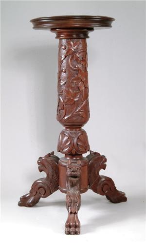 CARVED FERN STAND. Beautifully carved mahogany fern stand has heavy round pedestal with vines, leaves and berries deeply carved within. The pedestal is supported by three lion and paw legs. SIZE: 17 in. dia top x 39-1/2 in. t. CONDITION: Very good to excellent. 5-71327