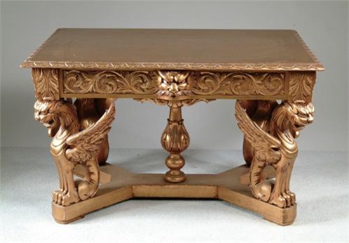 CARVED GRIFFIN TABLE. Very heavily gilt carved table has Griffin legs with carved acanthus leaf center pedestal and two carved drawers with high relief lion's head pulls and deep swirling leaf design which carries around the entire border of the table. The top is bordered by a carved leaf design. The table is finished in beautiful gold gilt with a gold leaf top. SIZE: 48 in. w x 33 in. d x 30 in. t. CONDITION: Very good to excellent. 5-71326