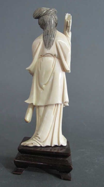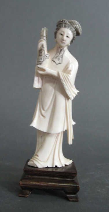 -of a woman holding a bamboo instrument. With black stained detailing.