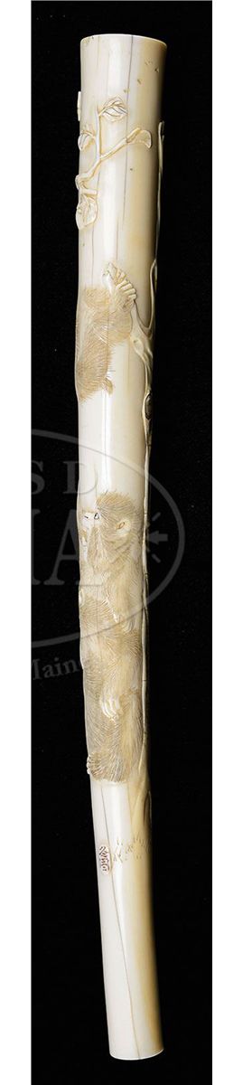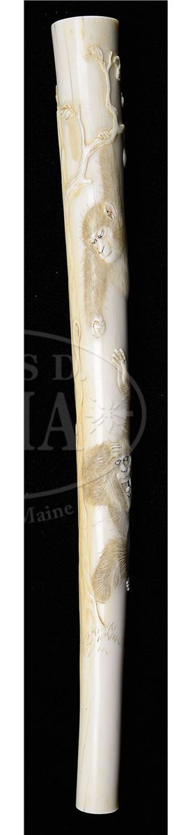 Meiji Period (1868-1912), Japan. Ivory parasol handle surface carved with monkeys. Signed. SIZE: 9-1/2" l. CONDITION: Hairline crack, otherwise very good. 9-92401