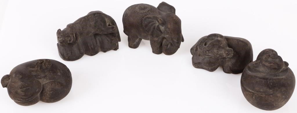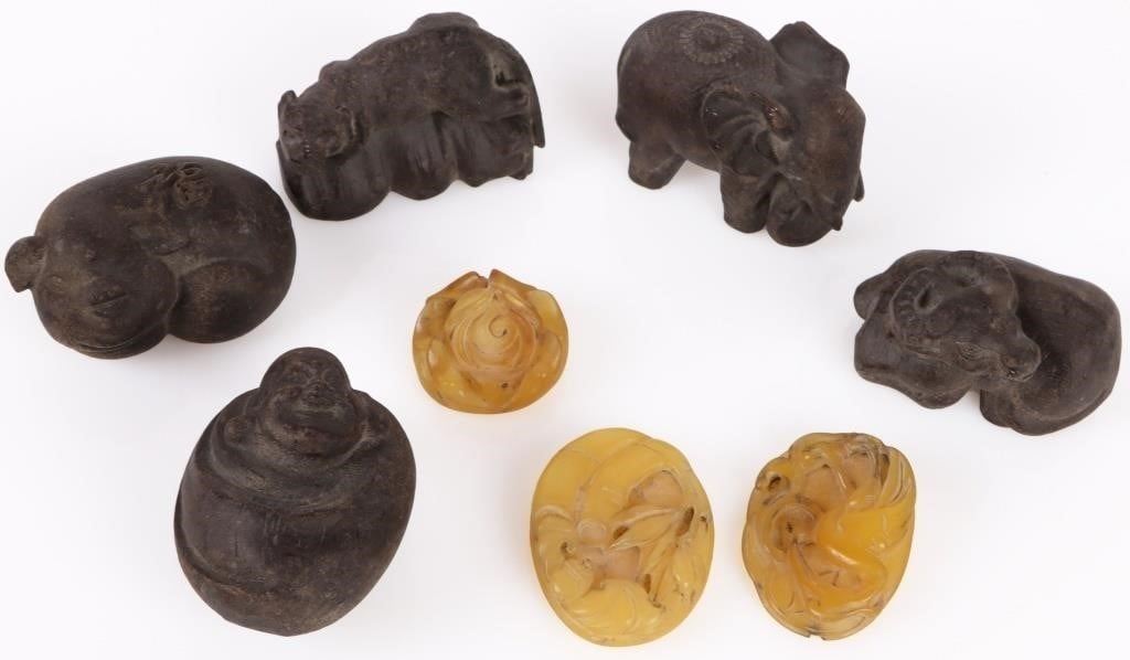 (1) Wood Pig Ornament, (1) Wood Feline Animal Ornament, (1) Wood Ram Ornament, (1) Wood Elephant Ornament, (1) Wood Baby Ornament, (1) Carved Yellow Jade Flower, (1) Carved Yellow Jade Bat Ornament, & (1) Carved Yellow Jade Bird Ornament.