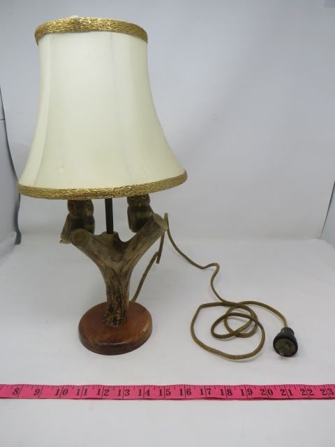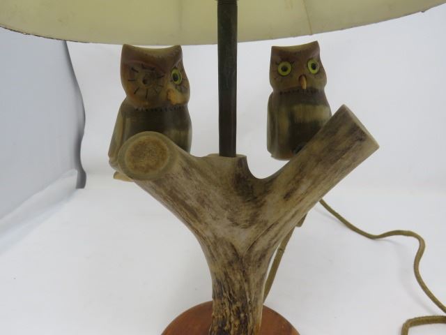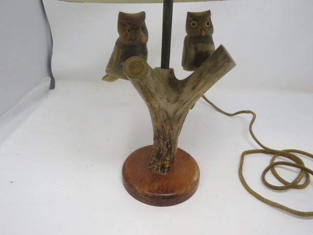 CARVED LAMP (VINTAGE) *DEER ANTLER* (2 OWLS) *17" TALL*