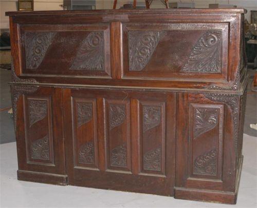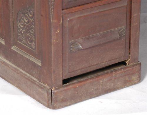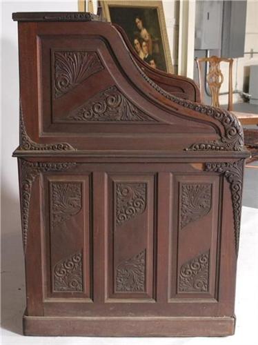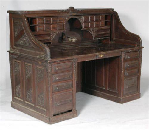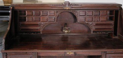 CARVED MAHOGANY ROLLTOP DESK signed Cutler, 66" wide, interior has slides rather than drawers for each cubby. circa 1910 , CONDITION: a few small losses to carving, backing to roll is original and very fragile, two sticks at back of roll already are detached. lacking frontage strip on left bank below bottom drawer. Left bank reinforced under base with some added glue blocks, finish original and crazed,
