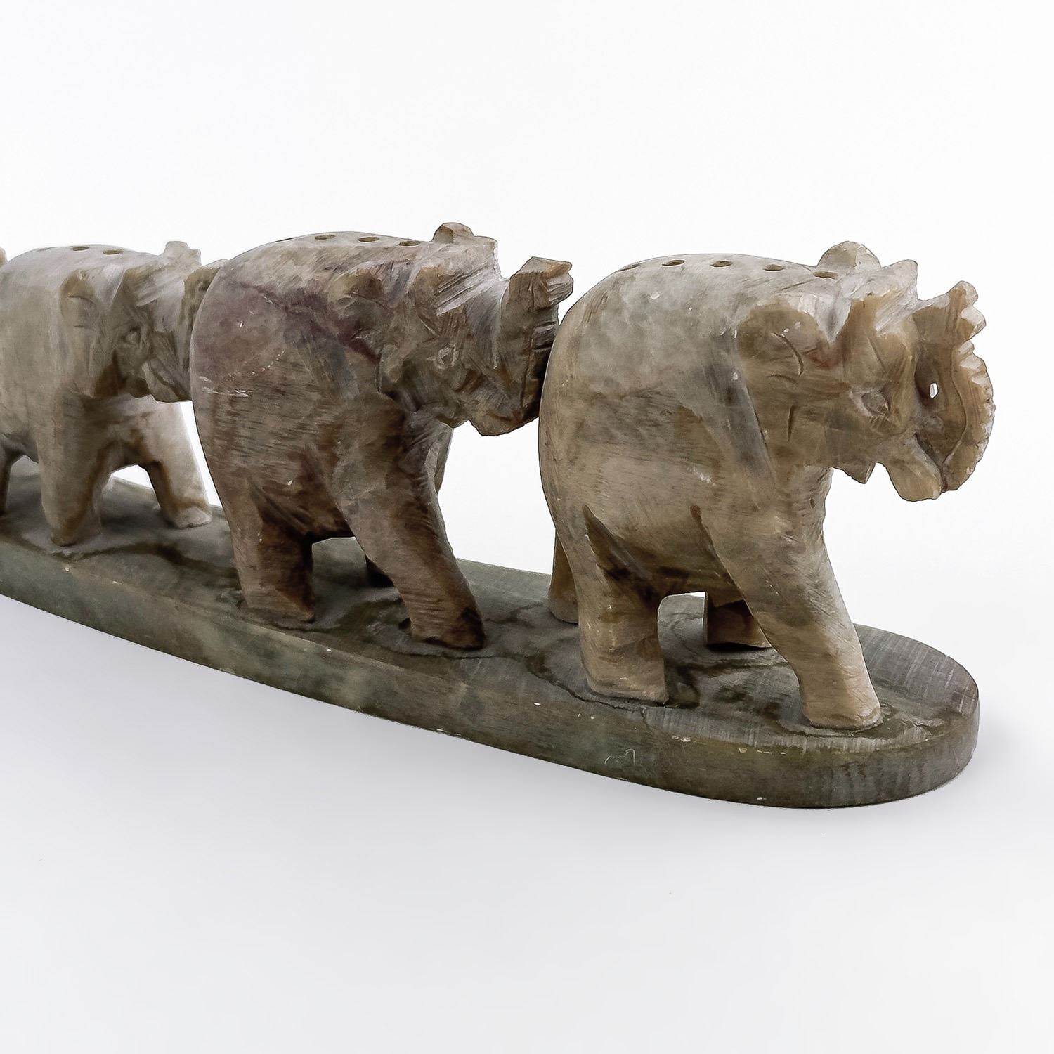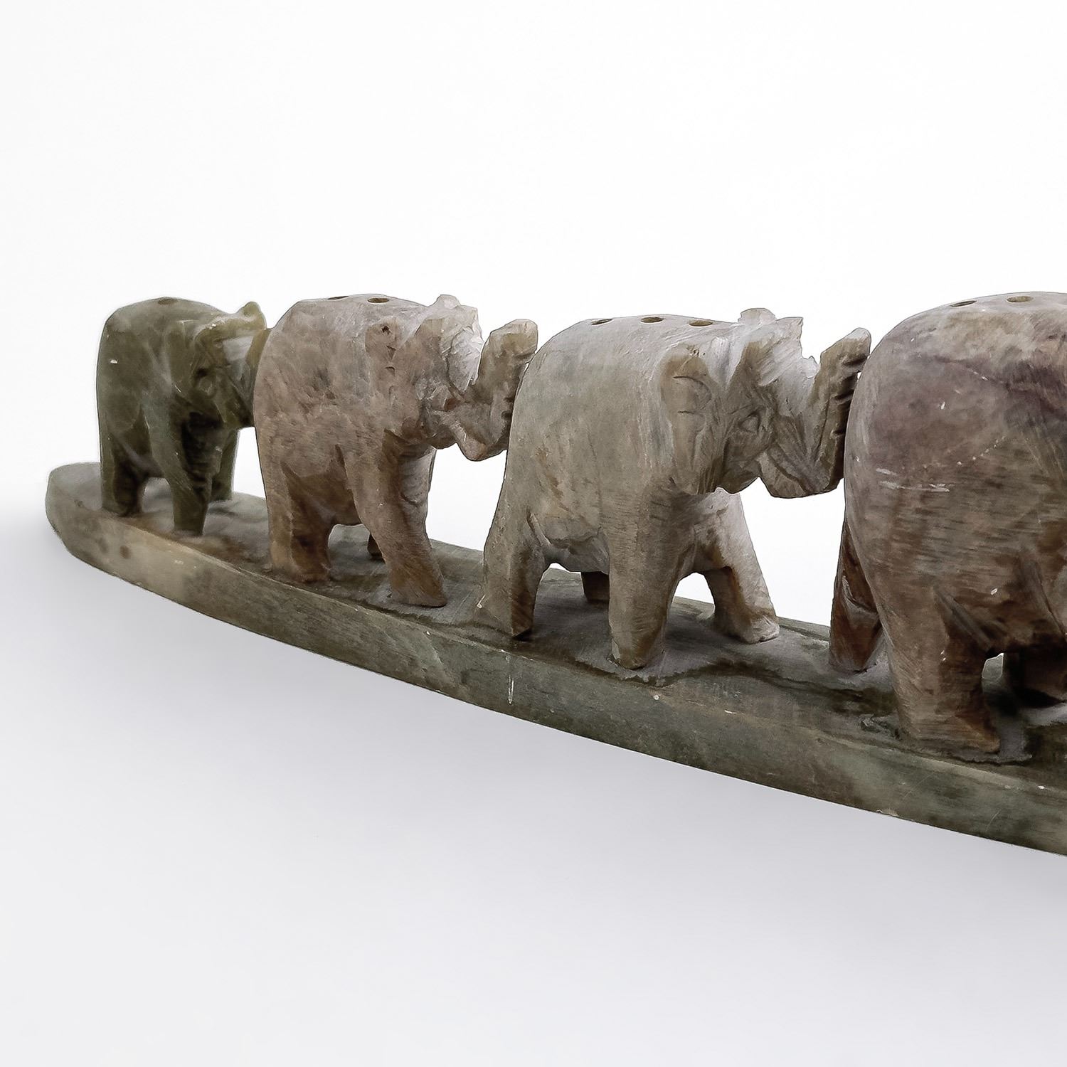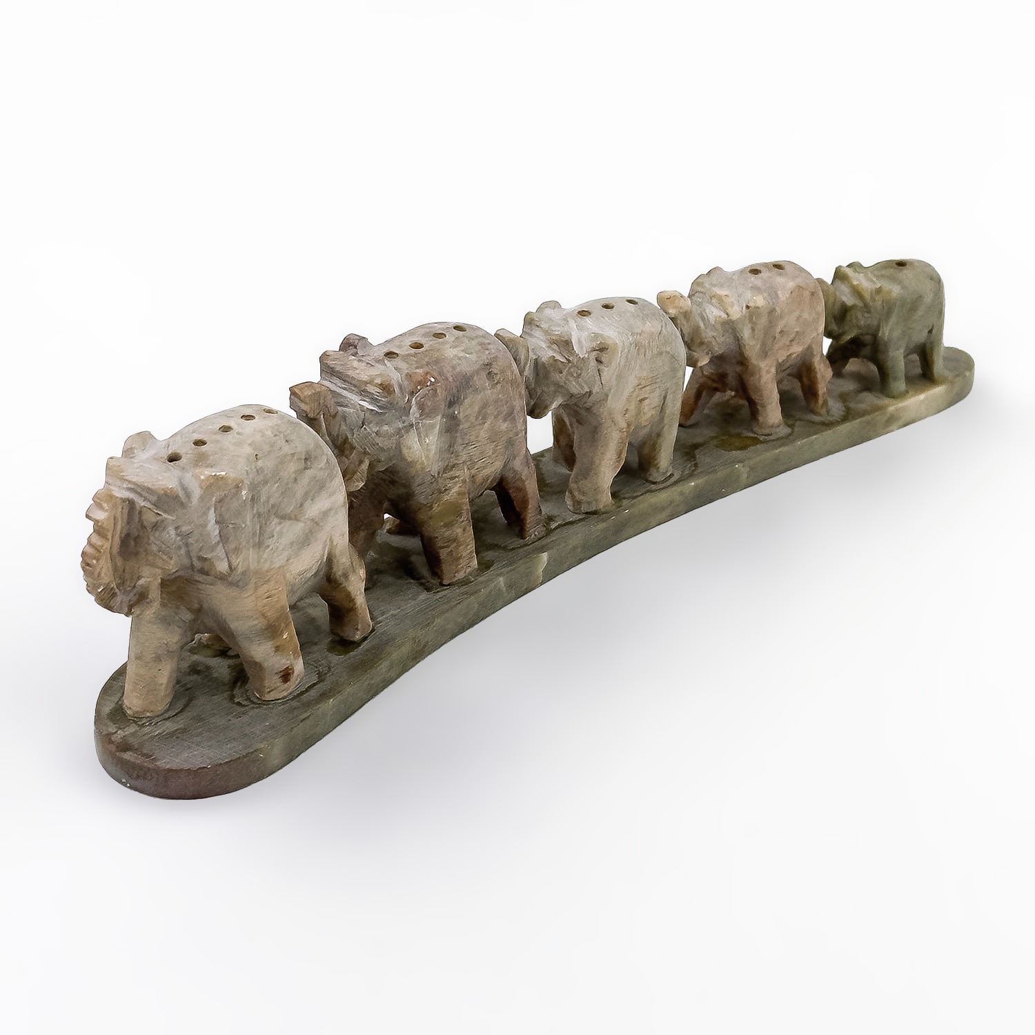 #8292 - HAND CARVED FIVE ELEPHANT BRIDGE INCENSE STICK HOLDER - OR TOOTHPICKS. HOME, OFFICE OR BAR BARWARE DECOR ELEPHANT SCULPTURE FIGURINE. MEASURES: 8.25” (21 CM) LONG BY 1.5” (4 CM) WIDEST PART AND STANDS 2.38” (5.5 CM) HIGH
