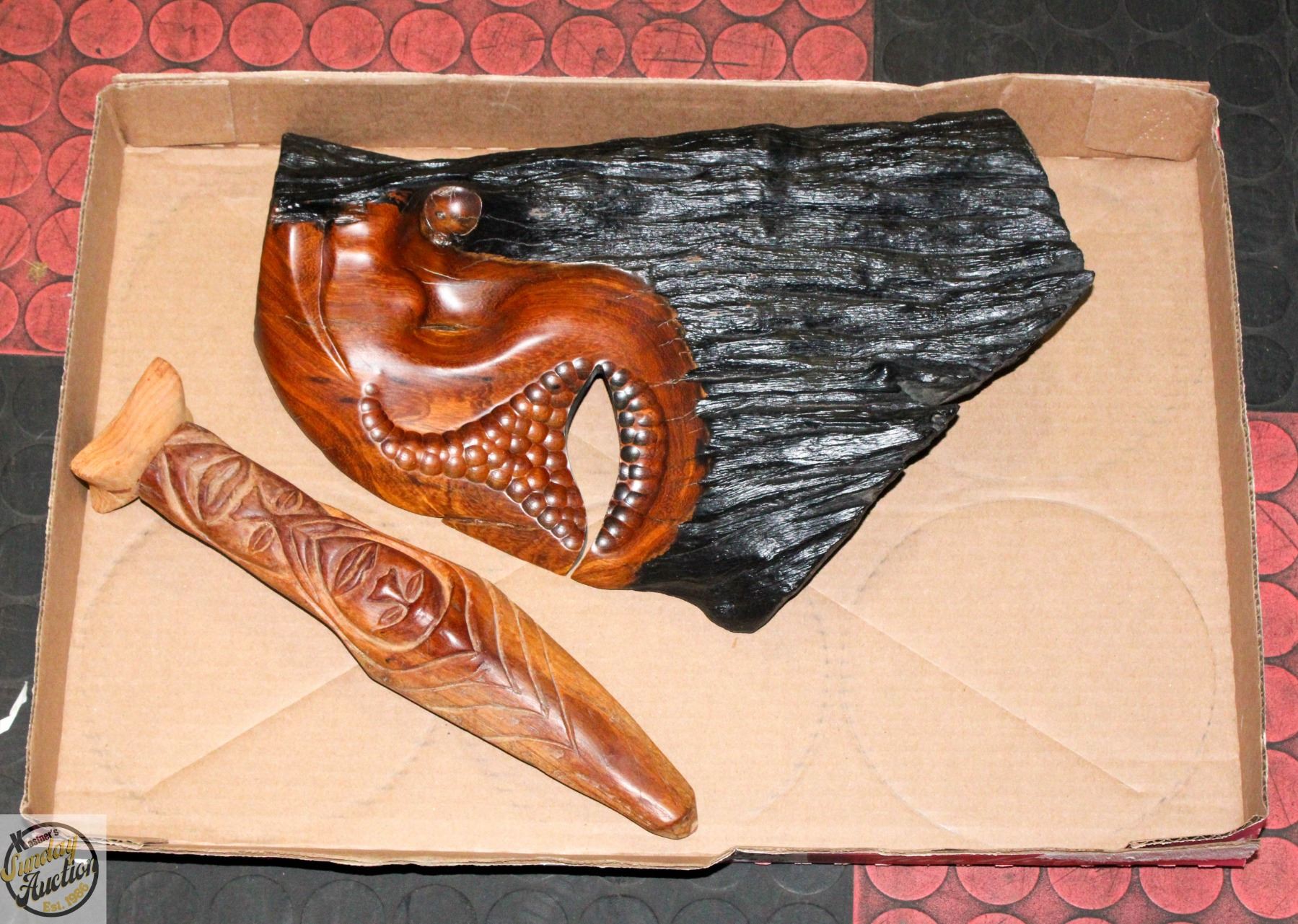 SOLID WOOD, HAND CARVED MASK. MADE IN COSTA RICA. SIGNED AND NUMBERED. OTHER SMALL HAND CARVED WOODEN SCULPTURE. **ALL ITEMS MUST BE REMOVED BY 5PM SATURDAY, JUNE 14TH 2025. ALL REMAINING ITEMS WILL BE SUBJECT TO A $6.00 PER DAY STORAGE CHARGE. ANY ITEMS REMAINING AFTER MONDAY, JUNE 30TH, 2025 WILL BE CONSIDERED FORFEITED. NO REFUNDS WILL BE ISSUED FOR FORFEITED ITEMS. TO SCHEDULE A PICK UP APPOINTMENT CLICK HERE