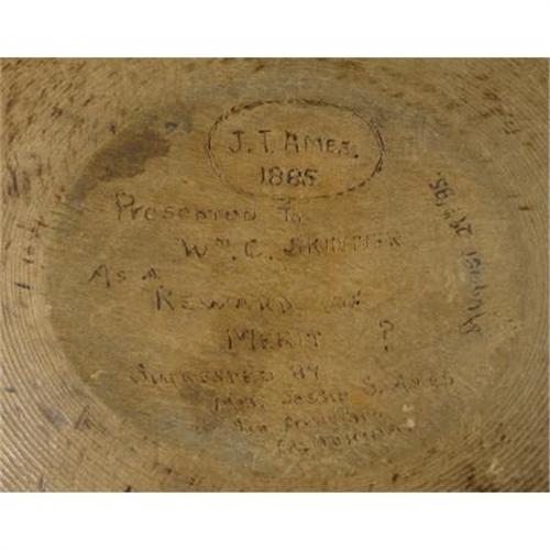<B>CARVED NUTWOOD BOWL</B></I><BR>Circa 1885<BR><BR>A carved nutwood fruit bowl. Inscribed to base <I>J.T. Ames, 1885/Presented to Wm. C. Skinner As a Reward of Merit?/Suggested by Mrs. Jessie S. Ames, San Francisco, California/August 29th '85</B></I><BR>3-1/2in. high with 13in. diameter<BR><BR> <B>Condition Report:</B> Normal signs of wear as appropriate with age; small crack to exterior, some very minor scratching.<BR><BR><b>Shipping:</b> Miscellaneous Collectibles, Smal (<a target="_blank" href="http://www.heritageauctions.com/common/shipping.php">view shipping information</a>)