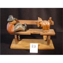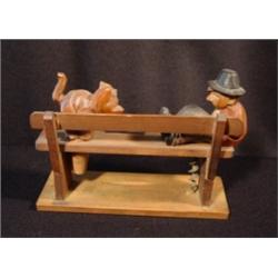 6" by 7 1/2" by 3" Carved and painted wood bar set. Old man corkscrew resting on a bench looking at a cat. Bottle stopper, missing a piece, probably German.