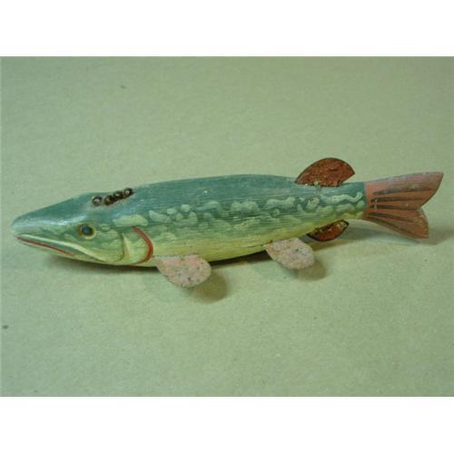 THE 8" SALMON IS VERY WELL DONE, WITH A CARVED TAIL RECESSED CARVED OUT EYES AND MOUTH, THE WOOD LOOKS TO BE OAK WITH THE FINS MADE OF TIN, THERE ARE TWO WEIGHTS ON THE UNDERSIDE, IT IS IN EXCELLENT ORIGINAL CONDITION, THIS IS A FINE PIECE OF FOLKART AS WELL AS GREAT DECOY FOR SPEAR FISHING