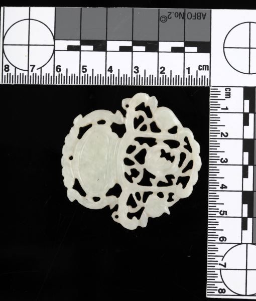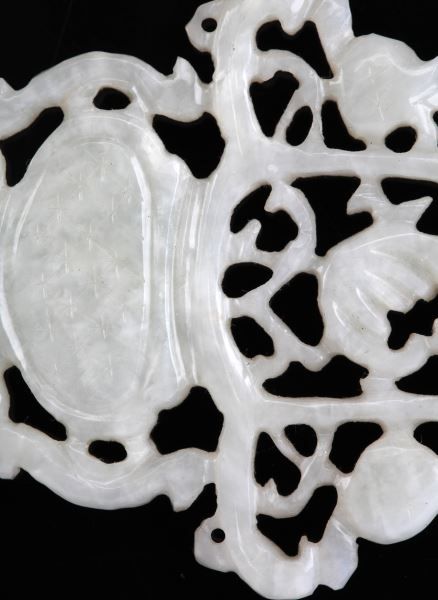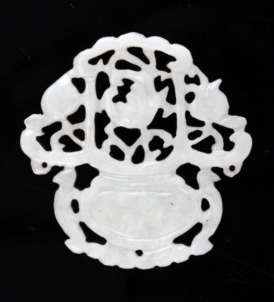 Intricately carved white "mutton fat" jade pendant with even stone color and high polish depicting peonies (Huawang) in a vase. No chips, cracks, or damage. Measures approximately 2 by 2 inches and weighs about 16.7 grams. Overall in very good to excellent condition.