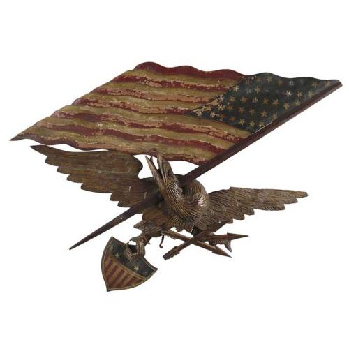 CARVED WOOD AND PAINT DECORATED AMERICAN EAGLE WALL PLAQUE ATTRIBUTED TO GEORGE STAPF. George Stapf (1862-1958), Harrisburg and Lancaster, Pennsylvania, Circa late 19th Century. The head and upper body facing upward left with open beak and spread wings. Surmounted by an unfurled American flag with applied and painted stars, and grasping a shield in its right talon and arrows in its left talon. The flag and shield with red, white and blue polychrome surface. REFERENCE: For a similar eagle see Sotheby’s Sale No. 8097, May 19th, 2005 Lot #140. SIZE: 30” l x 22-1/2” h. CONDITION: The piece appears to be in original paint and finish. Never has been restored in as found condition. There is a section of the top right wing, which is missing. Part of the flag staff and top staff ball is missing. The arrows have been affixed to the left of their original position. One arrow has slice chip and another is missing its end. There is paint chipping to the red stripes of the flag. Possibly missing a number of raised stars. A spectacular find in a mostly intact plaque. 9-27455
